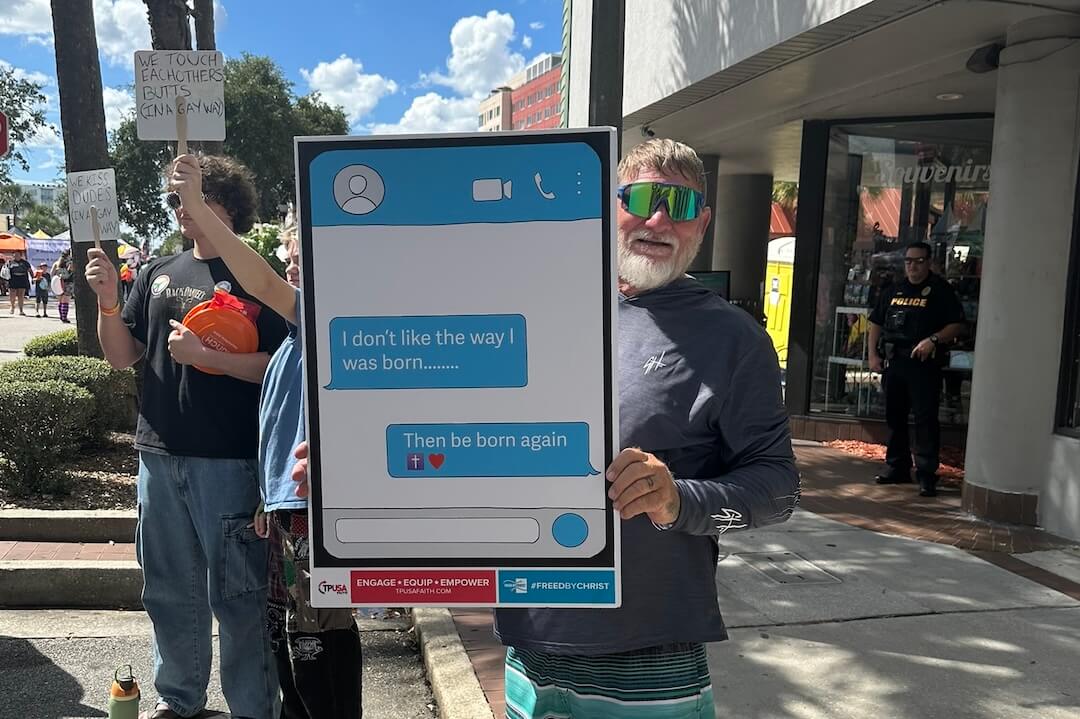 “That first year, there was maybe only like 10 of us,” Cronan recalled of his first time witnessing at Pride in 2023 alongside Pastor Rusty Thomas of American Reformation Church in Melbourne and now–TPUSA Faith Florida Director Seth Tweeddale. “Our original plan was just to hand out tracts and hand out waters to people. Rusty Thomas grabbed the mic and started preaching during the parade and somebody struck the mic out of his hand and broke the microphone off the bat. That was what started my journey with Pride Fest preaching.”